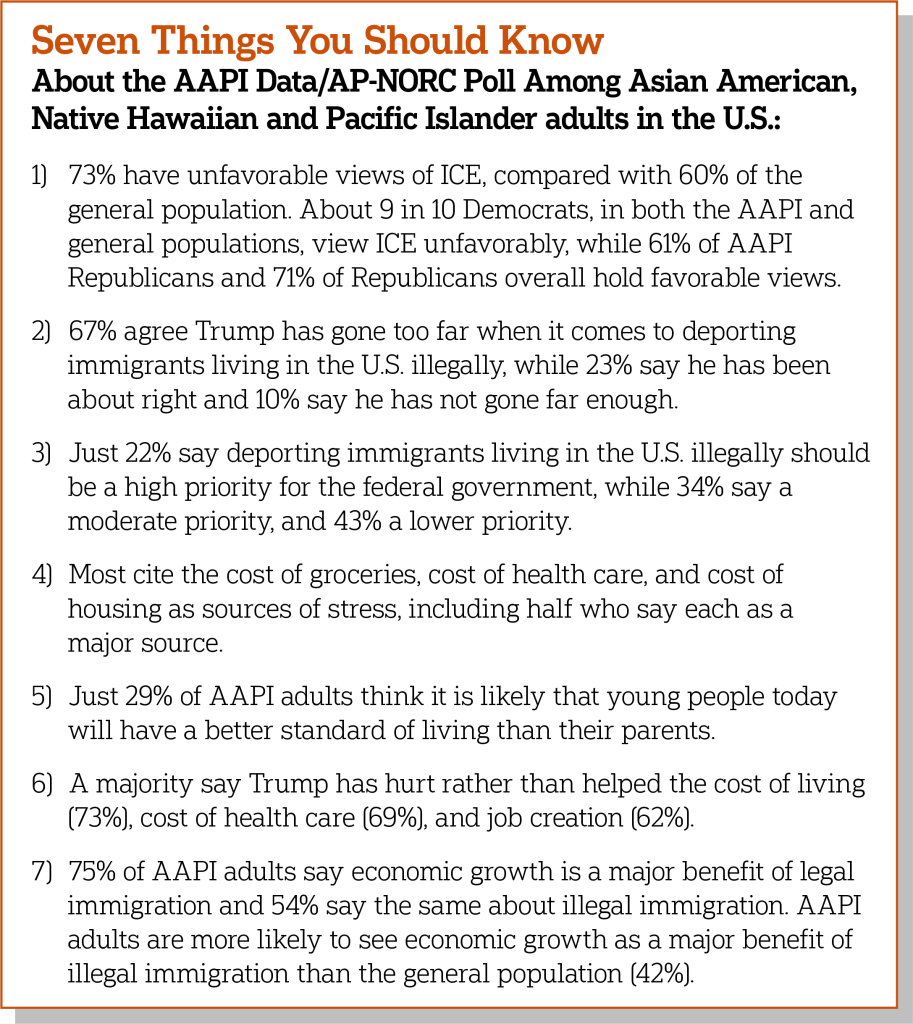 The nationwide study was conducted by The AP-NORC Center for Public Affairs Research and AAPI Data from February 2-9, 2026, using the Amplify AAPI Monthly Survey drawing from NORC’s Amplify AAPI® Panel designed to be representative of the U.S. Asian American, Native Hawaiian, and Pacific Islander household population. Online interviews were offered in English, the Chinese dialects of Mandarin and Cantonese, Vietnamese, and Korean with 1,197 Asian American, Native Hawaiian, and Pacific Islanders aged 18 and older living in the United States. The margin of sampling error is +/- 4.6 percentage points.