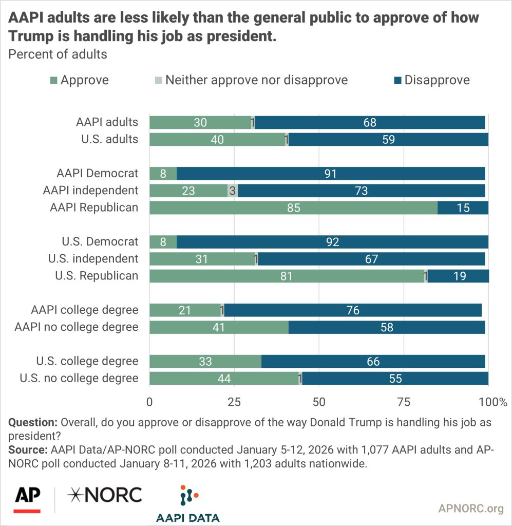 Nearly 70% of AAPI adults disapprove of how Trump is handling his job as president. Trump’s overall job approval is slightly lower among AAPI adults than the general public, according to the AP-NORC January 2026 Poll.