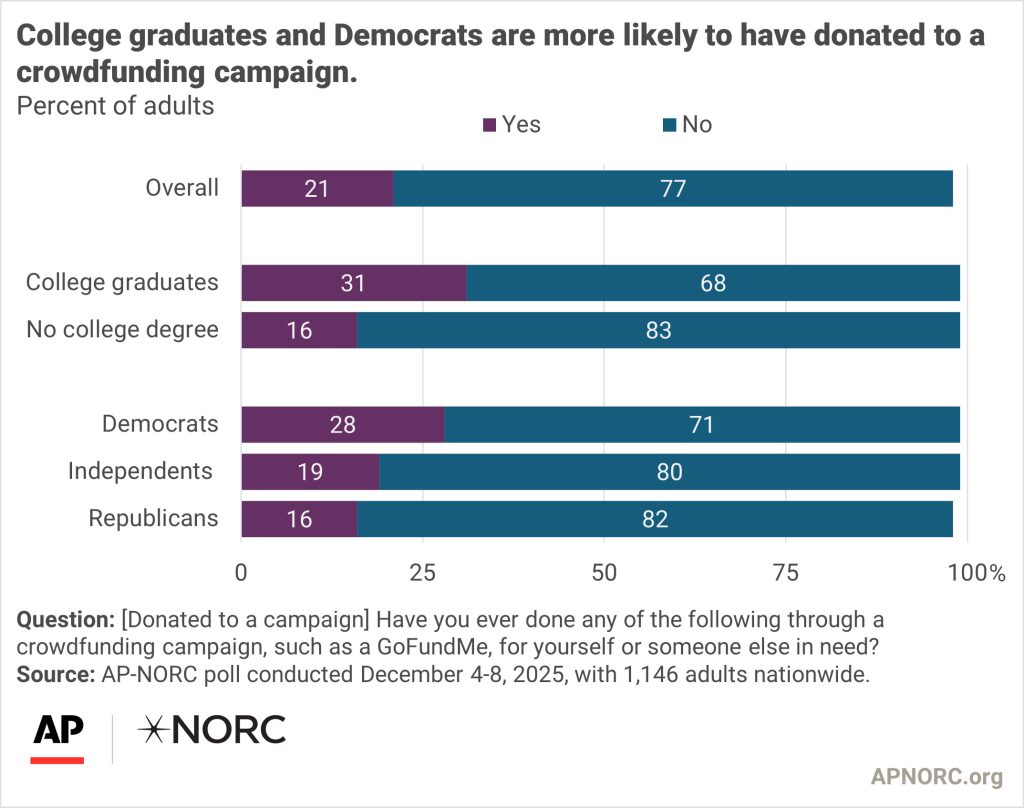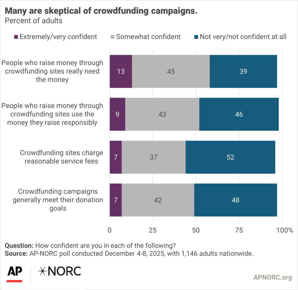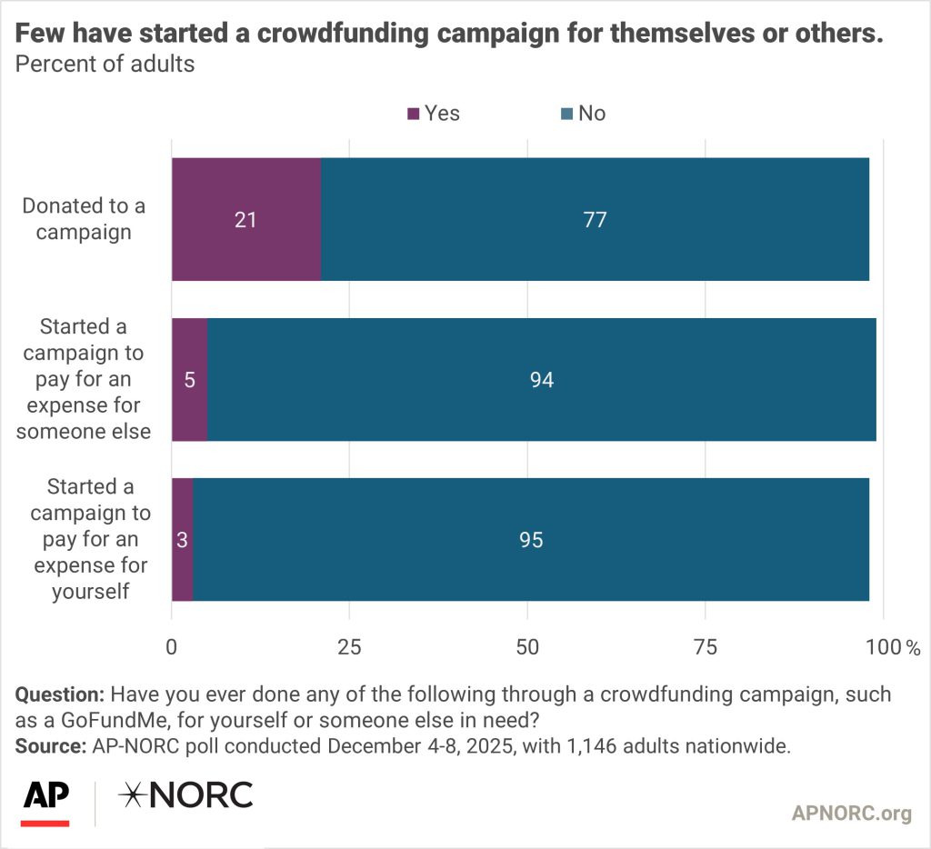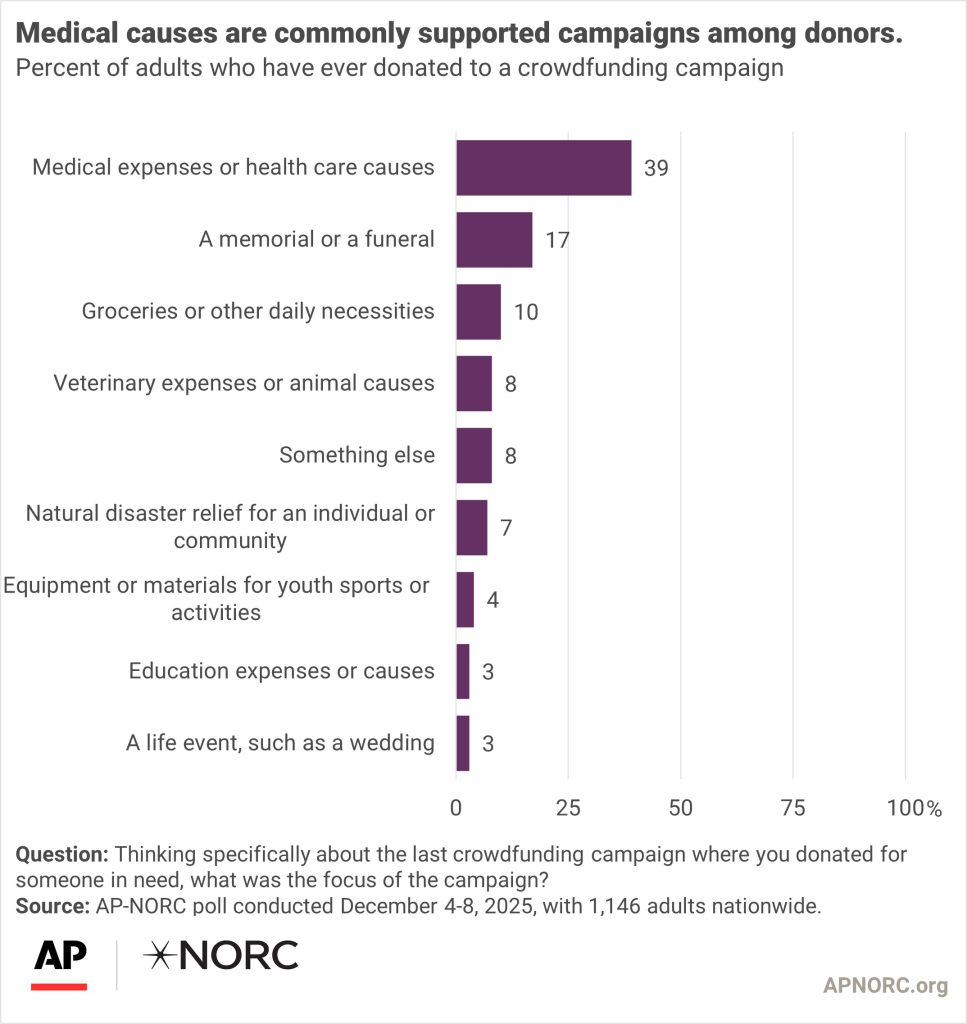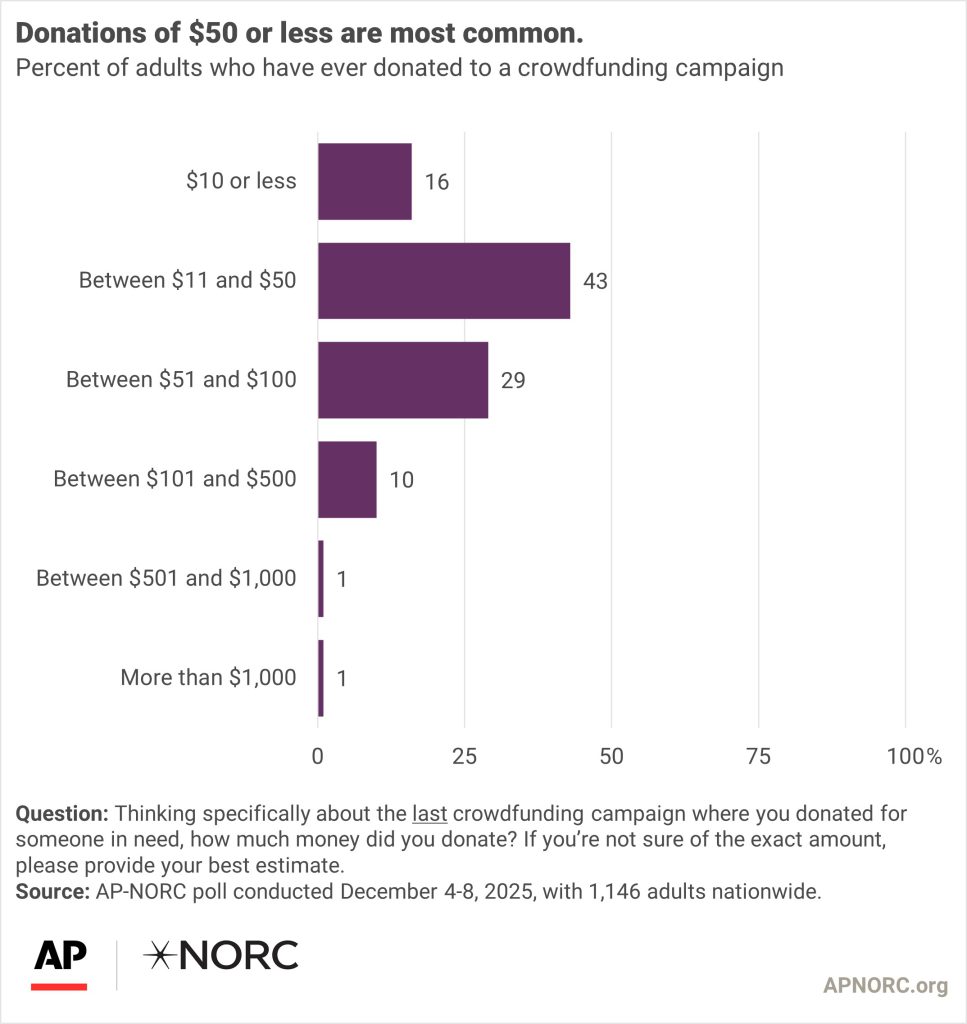 - Suggested Citation: AP-NORC Center for Public Affairs Research. “Crowdfunding contributions tend to be small donations to help others in need” (January 2026). https://apnorc.org/projects/crowdfunding-contributions-tend-to-be-small-donations-to-help-others-in-need/