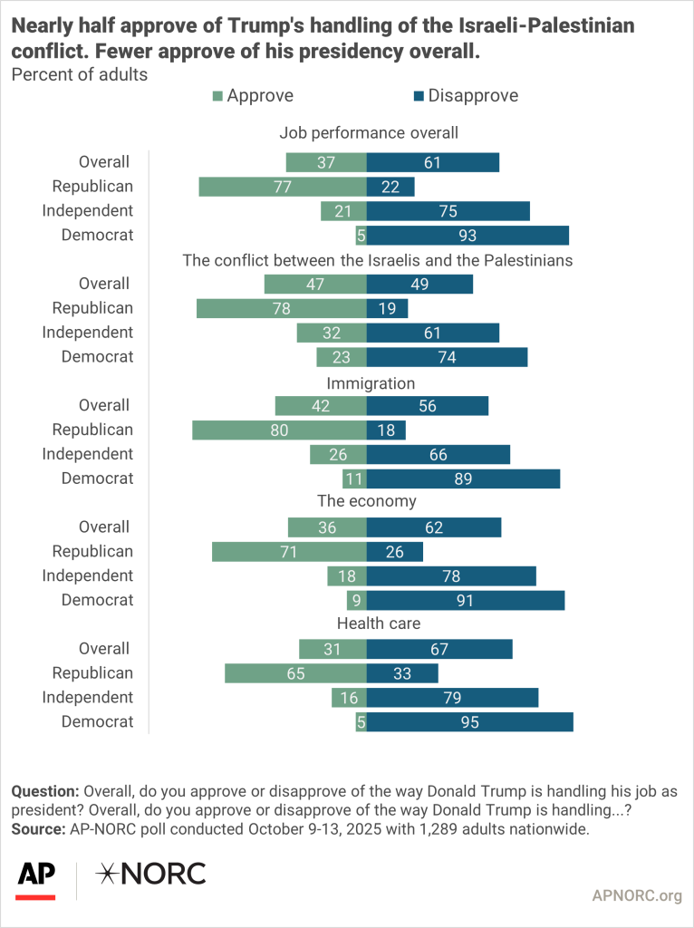 Forty-seven percent approve of how Trump is handling the Israeli-Palestinian conflict, up 10 percentage points from September. The October AP-NORC poll was taken after the ceasefire deal was announced but before the hostages and prisoners were freed. Opinions of Trump’s job performance overall and his handling of the economy, health care, and immigration are about the same as September.