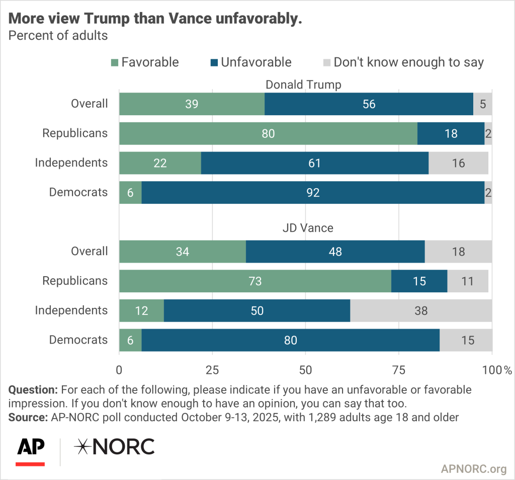 Fifty-six percent of adults have an unfavorable opinion of Trump and 39% favorable. Vice President Vance’s approval and disapproval numbers are slightly lower with more people saying that they don’t know enough to have an opinion.