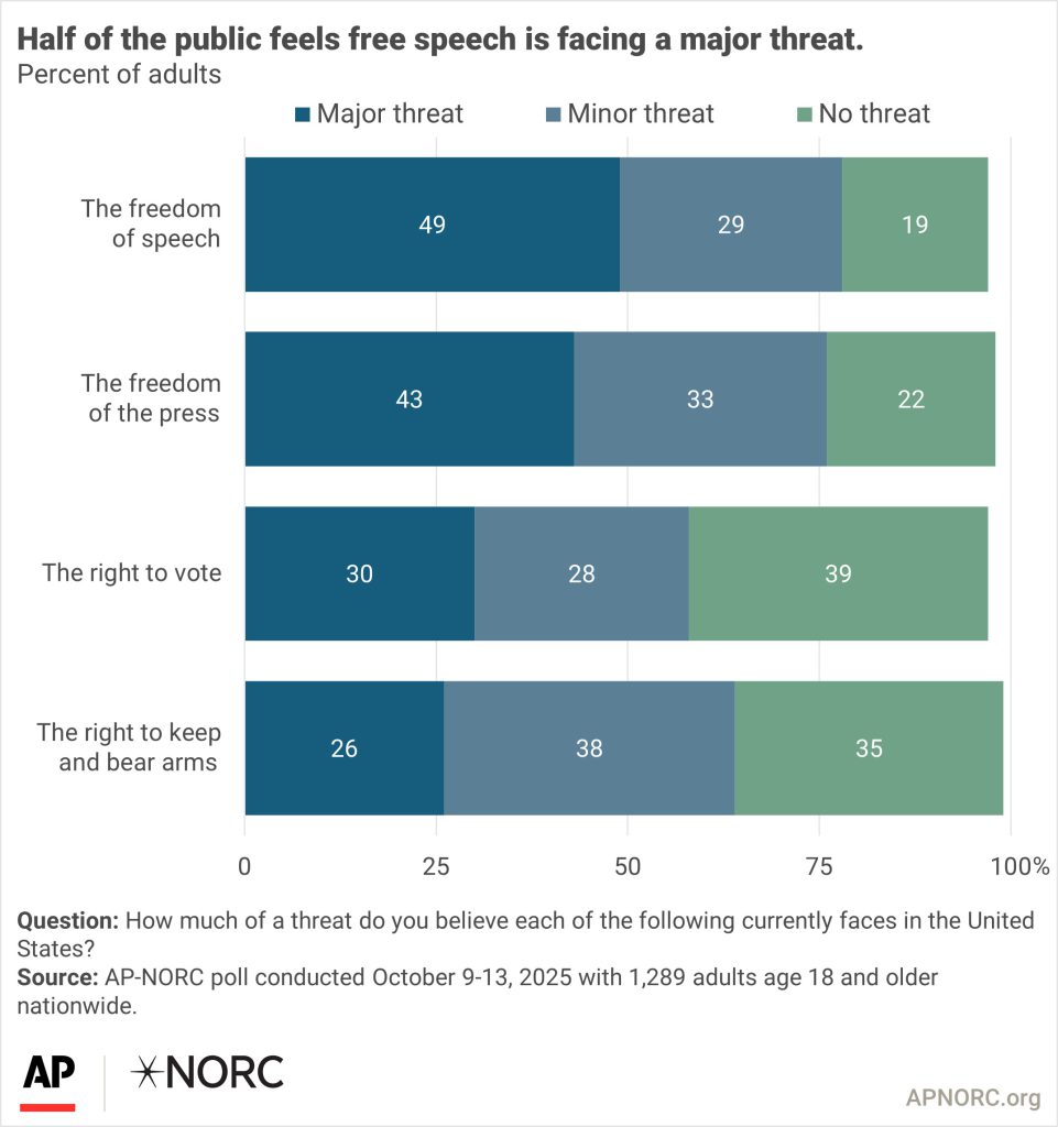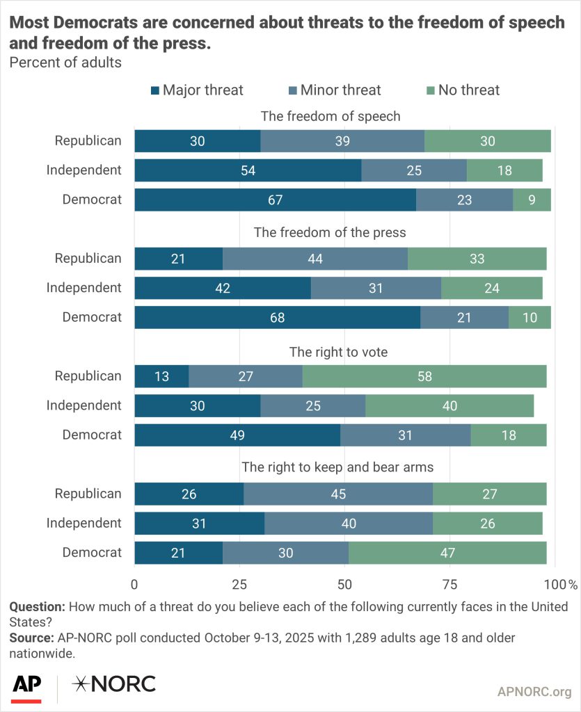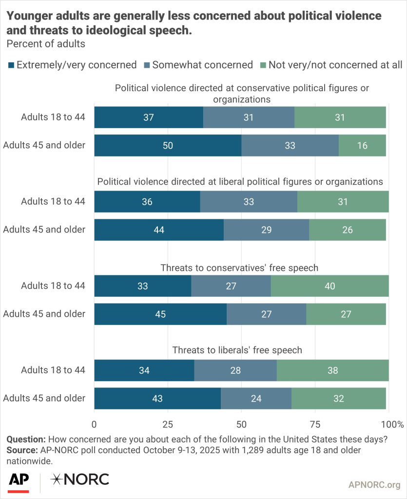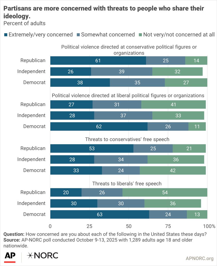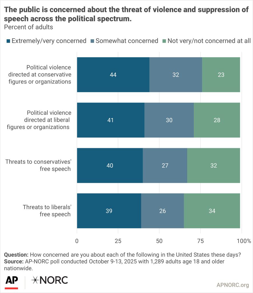 - Suggested Citation: AP-NORC Center for Public Affairs Research. “Many concerned about political violence and threats to free speech across the ideological spectrum.” (October 2025). https://apnorc.org/projects/many-concerned-about-political-violence-and-threats-to-free-speech-across-the-ideological-spectrum/