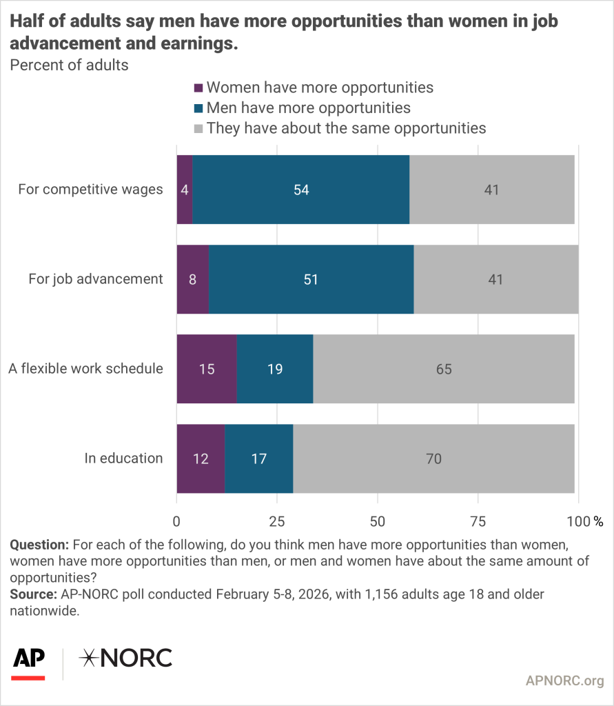 - Suggested Citation: AP-NORC Center for Public Affairs Research. “Most adults perceive gender gaps in pay and promotion opportunities” (February 2026). https://apnorc.org/projects/most-adults-perceive-gender-gaps-in-pay-and-promotion-opportunities/
