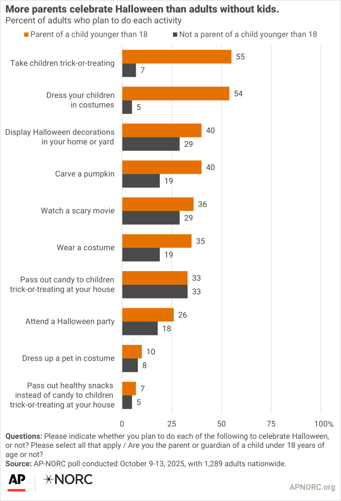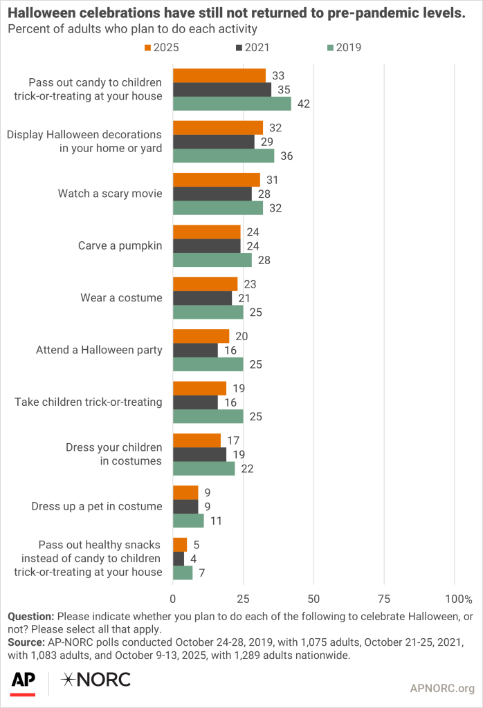 - Suggested Citation: AP-NORC Center for Public Affairs Research. “Most are getting into the Halloween spirit, but the holiday has not fully rebounded post-pandemic.” (October 2025). https://apnorc.org/projects/most-are-getting-into-the-halloween-spirit-but-the-holiday-has-not-fully-rebounded-post-pandemic/