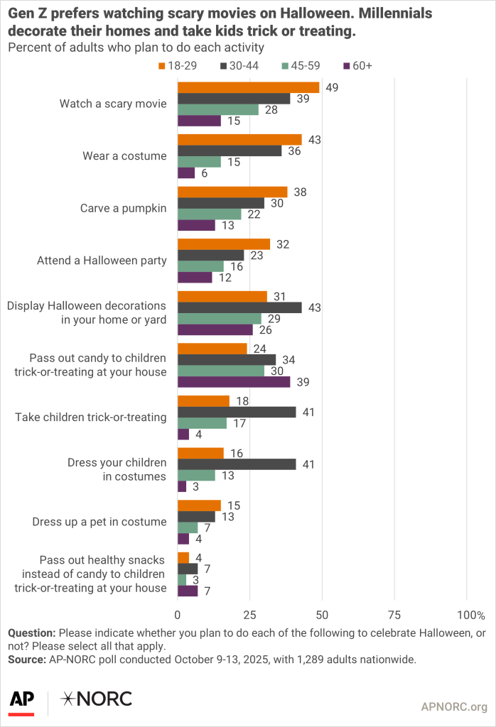 Gen Z adults (ages 18-29) are more inclined than those 45 and older to attend Halloween parties, carve pumpkins, wear costumes, or watch scary movies.