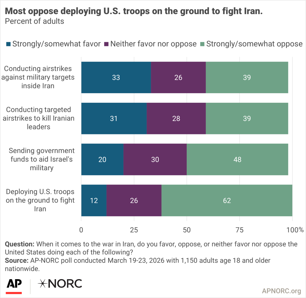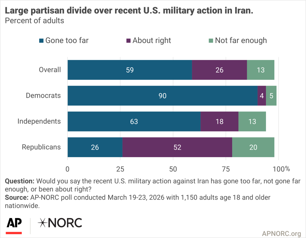 - Suggested Citation: AP-NORC Center for Public Affairs Research. “Most say the United States’ recent military actions against Iran have gone too far” (March 2026). https://apnorc.org/projects/most-say-the-united-states-recent-military-actions-against-iran-have-gone-too-far/