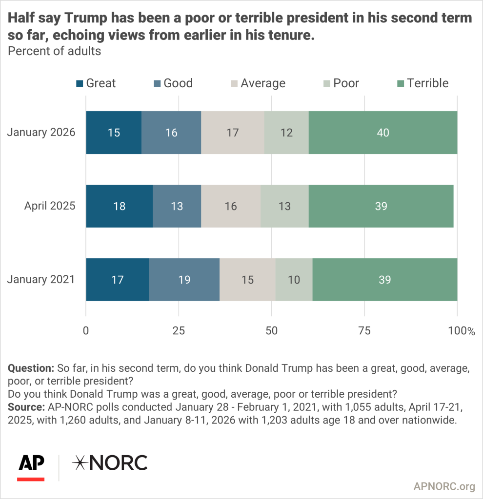 The public’s assessment of Trump’s performance in office is remarkably steady. Three in 10 adults say Trump has been a good or great president so far in his second term, and 17% say he’s been average. Fifty-two percent say he has been a poor or terrible president. These results are similar to findings from AP-NORC polls conducted after the first few months of his second term and at the end of his first administration