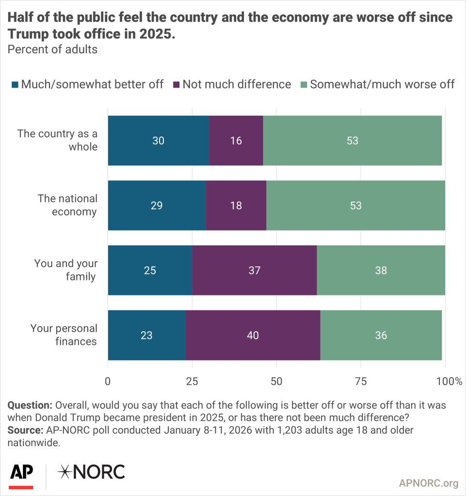 The nationwide poll was conducted January 8-11, 2026, using the AmeriSpeak® Panel, the probability-based panel of NORC at the University of Chicago. Online and telephone interviews using landlines and cell phones were conducted with 1,203 adults.