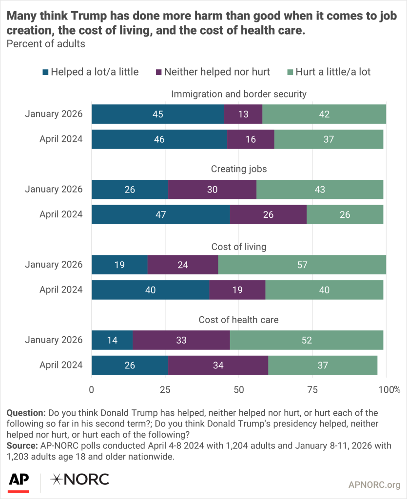 Now, while views are just about the same regarding immigration and border security, the president has lost ground on economic issues. Half of the public say Trump has hurt the cost of healthcare so far in his second term, and 57% say the same about the cost of living. Another 4 in 10 say that he has hurt job creation since taking office.